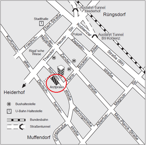 So erreichen Sie die internistische und hausärztliche Praxis in der Röntgenstraße 6, 53177 Bonn-Bad Godesberg: